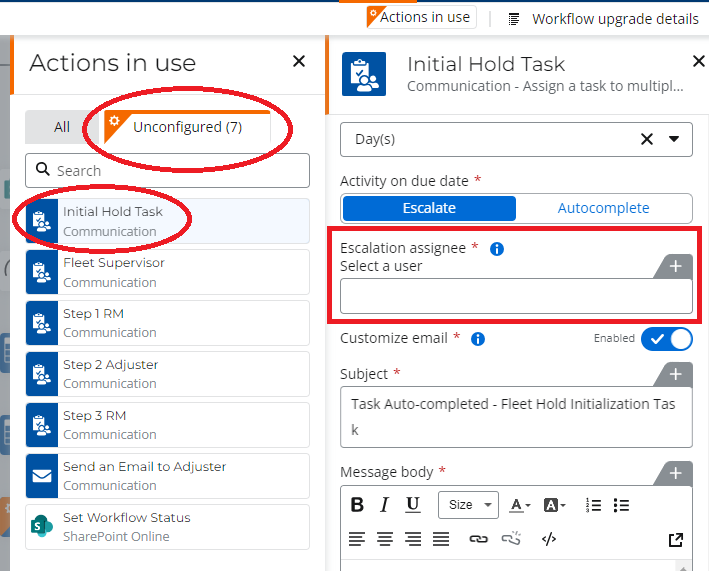 In terms of a solution, are you looking for a validation error, so the Escalation assignee (or any mandatory) field is highlighted? Or a way to be directed/pulled to this (or any other) unconfigured field?