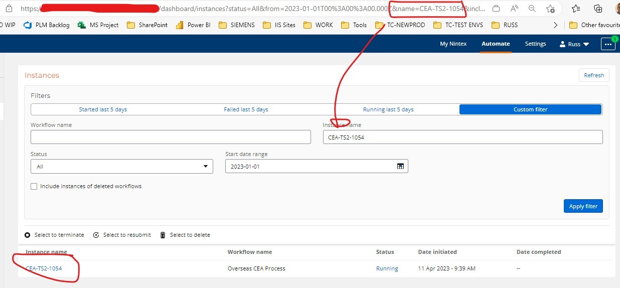 Hi Rick, with Instances and tasks I can construct a URL that prefilters the Dashboard to see progress and Tasks access the current pending one (1.jpg), .. But the userbase prefer the Workflow Tracking page of My Nintex, although there is a 'Search Instance' filter available there is no way to prepopulate that from URL (2.png).