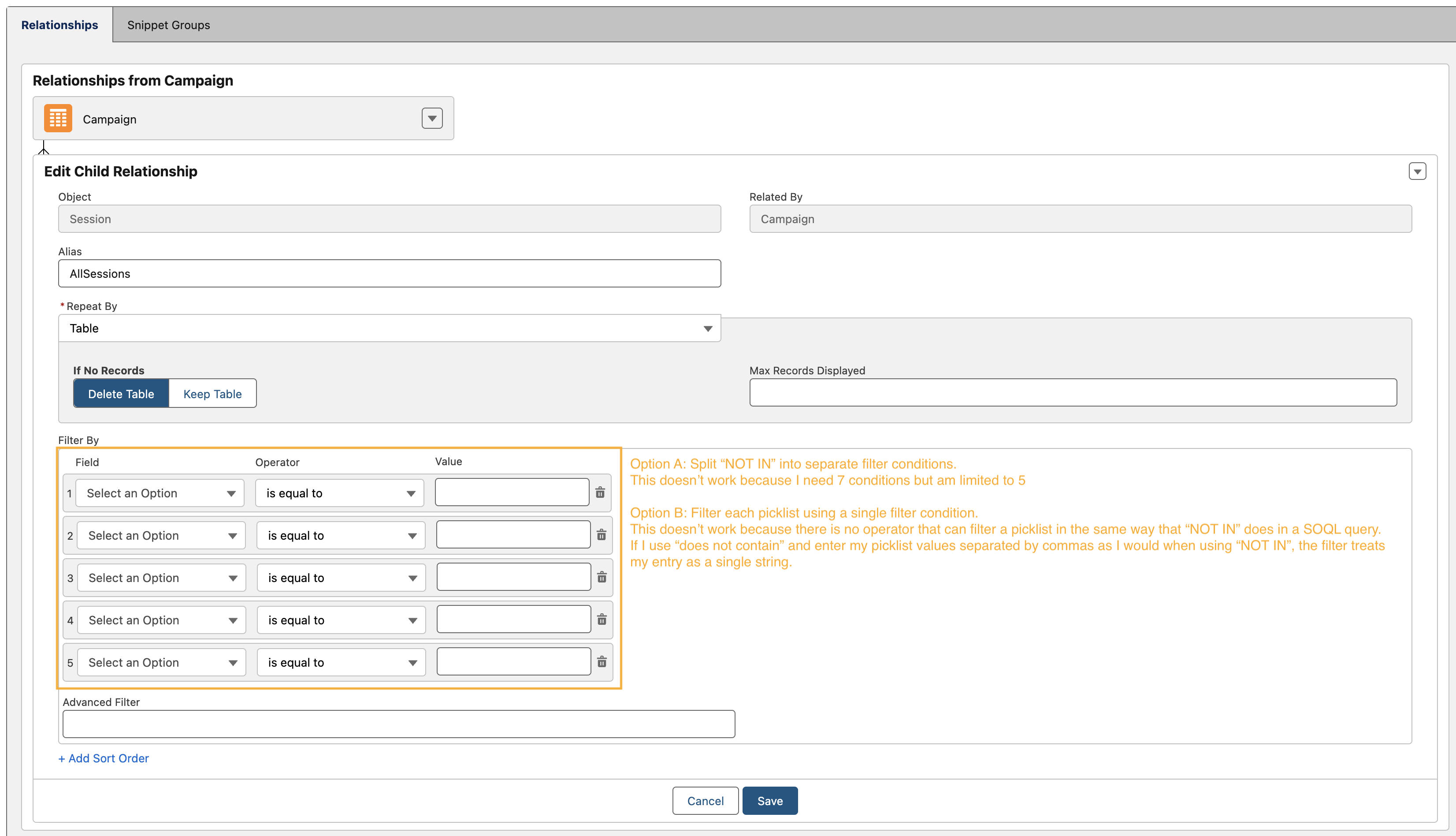 I have a DocGen package that requires more than 5 filter conditions to return the right data set. I would love to not need to create new checkbox formula fields for every DocGen package with complex filters.